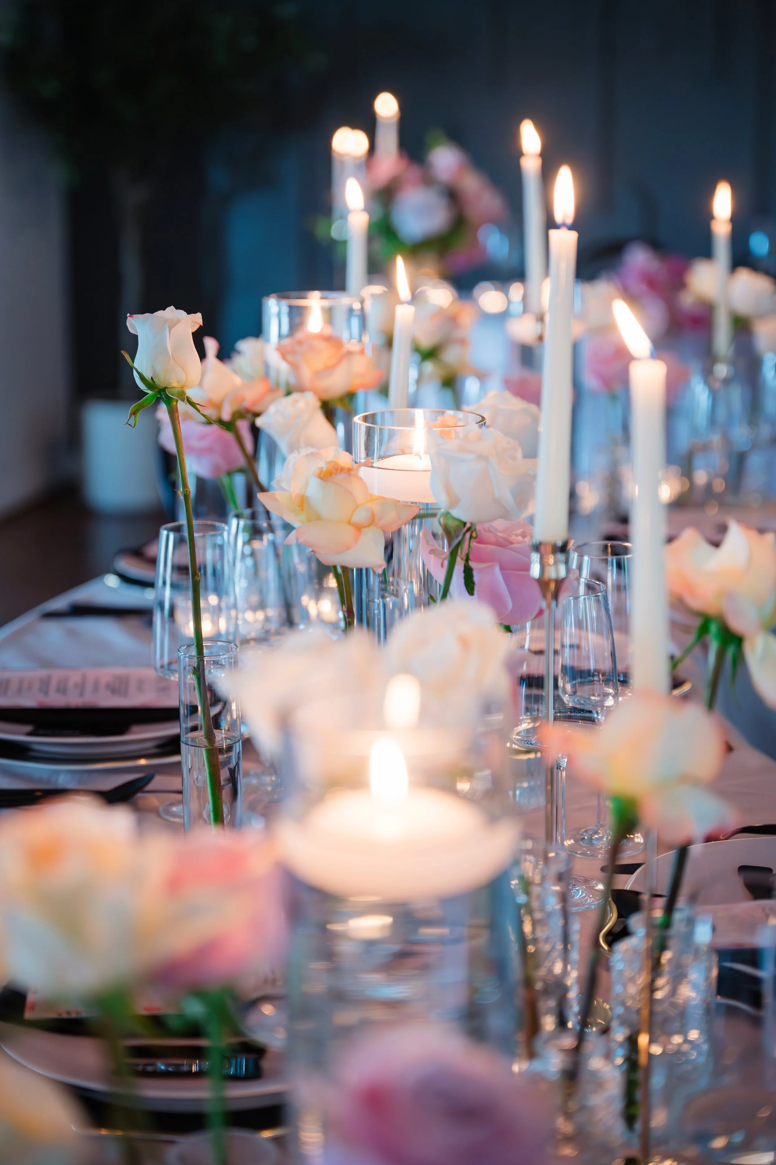 Elegant table decorated with pink and white roses, lit candles, and glassware for a formal event or wedding reception.